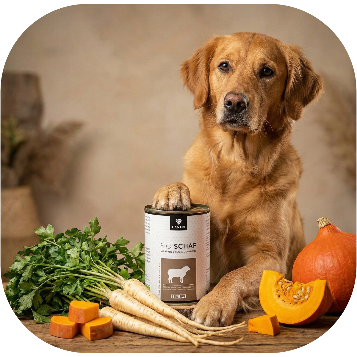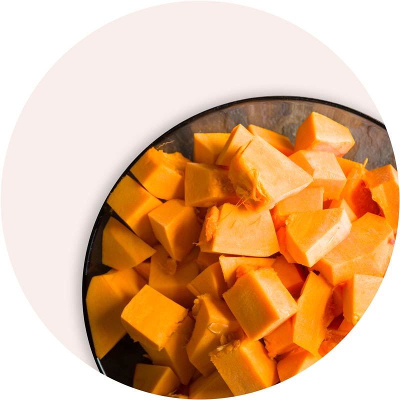 Kürbis bringt natürliche Ballaststoffe und ausgewählte Nährstoffe in die Rezeptur. Er ergänzt das Menü mit gut verträglichen Kohlenhydraten und sorgt für eine ausgewogene, harmonische Komponente im Napf.